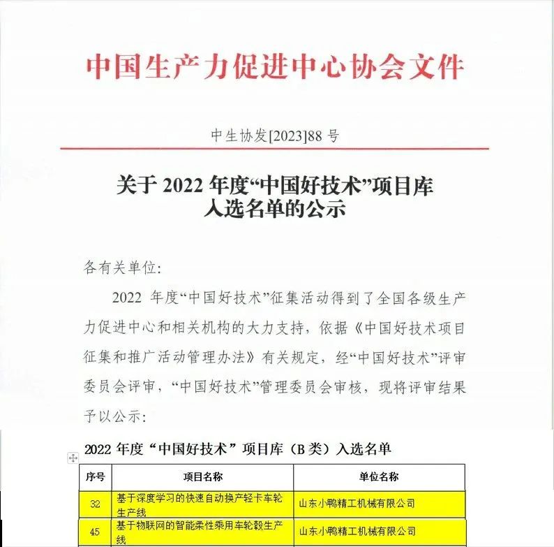 2022年度“中國好技術”評選活動經過專家組的嚴格評審,最終選出342項先進實用、貼近民生的“中國好技術”成果,其中小鴨精工的兩個項目:“基于物聯網的職能柔性乘用車車輪轂生產線”、“基于深度學習的快速自動換產輕卡車輪生產線”入選獎項。