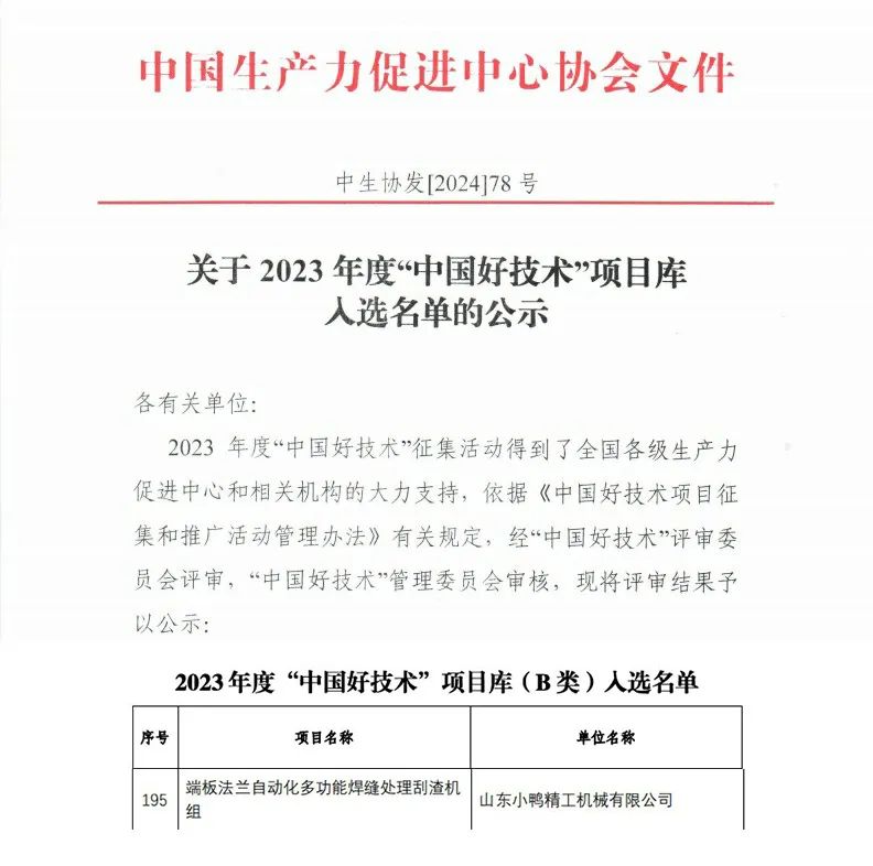 2023年度“中國好技術”評選活動經過專家組的嚴格評審,209項入選“中國好技術”項目庫(B類)并授予“中國好技術”稱號,其中小鴨精工的”端板法蘭自動化多功能焊縫處理刮渣機組”入選“中國好技術”項目庫(B類)。